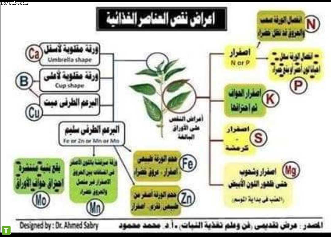 - أعراض نقص الماغنيسيوم: اصفرار كامل الورقة مع بقاء العروق الوسطية خضراء اللون-